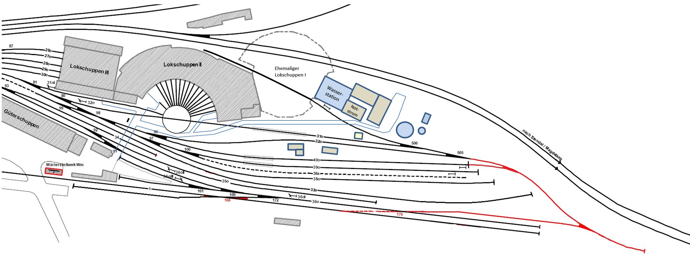 Ein Blick auf den Südgiebel des Museumsgebäudes des Lokschuppens 2. Darin sind Büros, Ausstellungsraum, Elektrowerkstatt und Tischlerei untergebracht. Das Obergeschoss ist vermietet. Früher diente dieser Gebäudeteil im Untergeschoss als Werkstatt. Im Obergeschoss waren Umkleideräume und Waschgelegenheiten für die Betriebsangehörigen eingerichtet.