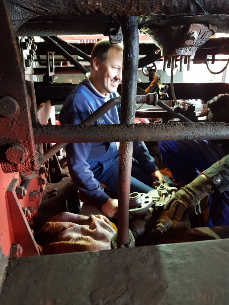 Im Inneren der Feuerkiste wurden die Roste kontrolliert, auf denen das Feuer brennt, wenn die Lokomotive angeheizt ist. Mit der Zeit zundern diese gusseisernen Roststäbe allerdings ab oder verbiegen aufgrund der thermischen Belastung. Sie müssen dann gegen neue ersetzt werden.