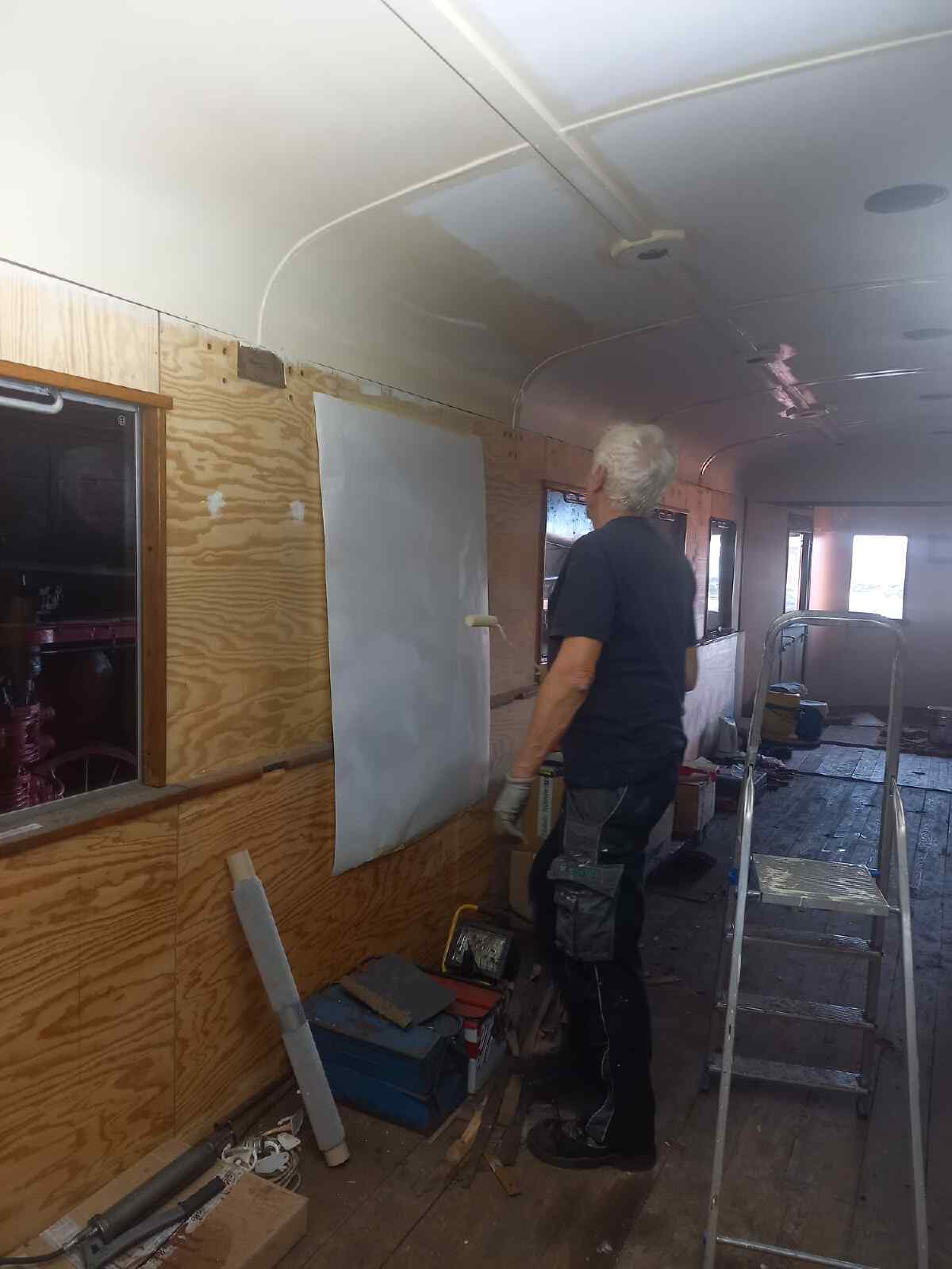 Außerdem gingen die Arbeiten an unserem Wagen 197 805 weiter. Nachdem nun alle Deckenplatten und Deckenleisten eingebaut sind, konnte die Decke mit Farbe versehen werden. Wir hoffen, dass wir bald einen neuen Linoleum-Belag auf den Fußboden verlegen können.