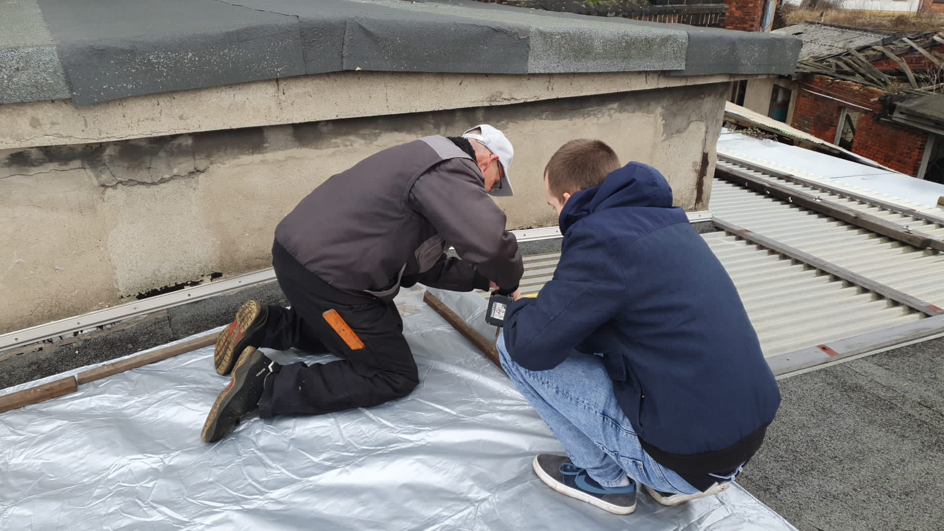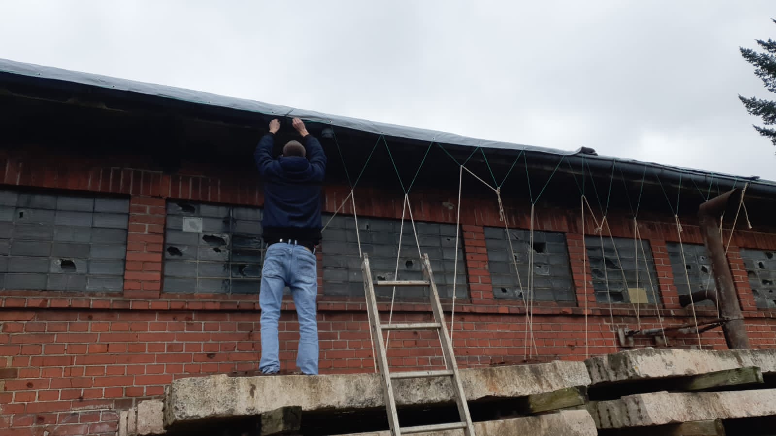 Leider muss man ab und zu mal einen unvorhergesehenen Einsatz einschieben, so auch am vergangenen Wochenende. So hatte sich bei den vergangenen Regentagen herausgestellt, dass das Dach der ehemaligen Halle für die Notstromerzeugung undicht geworden war. Hier wurde eine Plane angebracht, die provisorisch bis zum Frühjahr vor Ort bleiben soll, bis das Wetter das Aufbringen neuer Dachpappe zulässt.